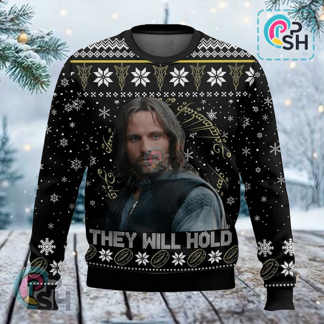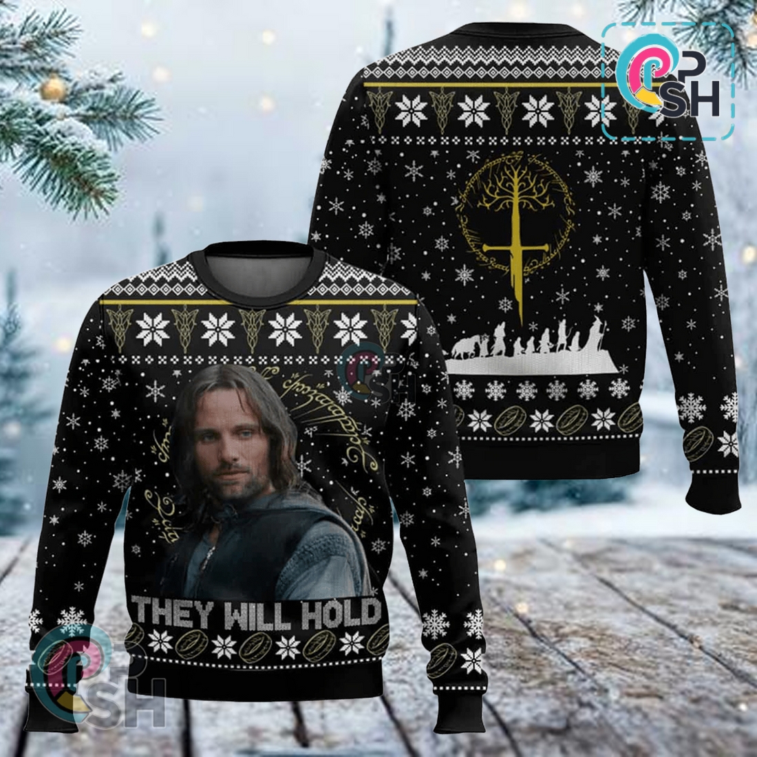 The material chosen for this sweater is paramount to its appeal, likely a premium, soft-touch acrylic blend, or a luxurious mix of cotton and wool, ensuring maximum comfort without any of the scratchiness often associated with traditional knits. It feels plush and gentle against the skin, making it perfect for long evenings by the fire, spirited holiday gatherings, or even a cozy marathon viewing of the – Lord of the Rings- trilogy. The substantial weight of the knit provides excellent insulation, making it an ideal layer for the colder months, protecting against winter’s chill while allowing for breathable comfort. Ribbed cuffs and a ribbed hem provide a secure, comfortable fit that retains its shape wear after wear, resisting stretching or sagging, while the classic crew neck offers timeless style suitable for all body types. This garment speaks directly to fans who desire to express their devotion to the saga in a unique, subtle yet profound way, moving beyond simple character prints to embrace a deeper, more resonant message. The “They Will Hold” quote embodies resilience, courage, and unwavering loyalty – themes that resonate not only within the epic narrative but also with the spirit of togetherness and endurance often celebrated during the holidays. It serves as an excellent conversation starter, allowing fellow fans to instantly recognize and appreciate the thoughtful design.