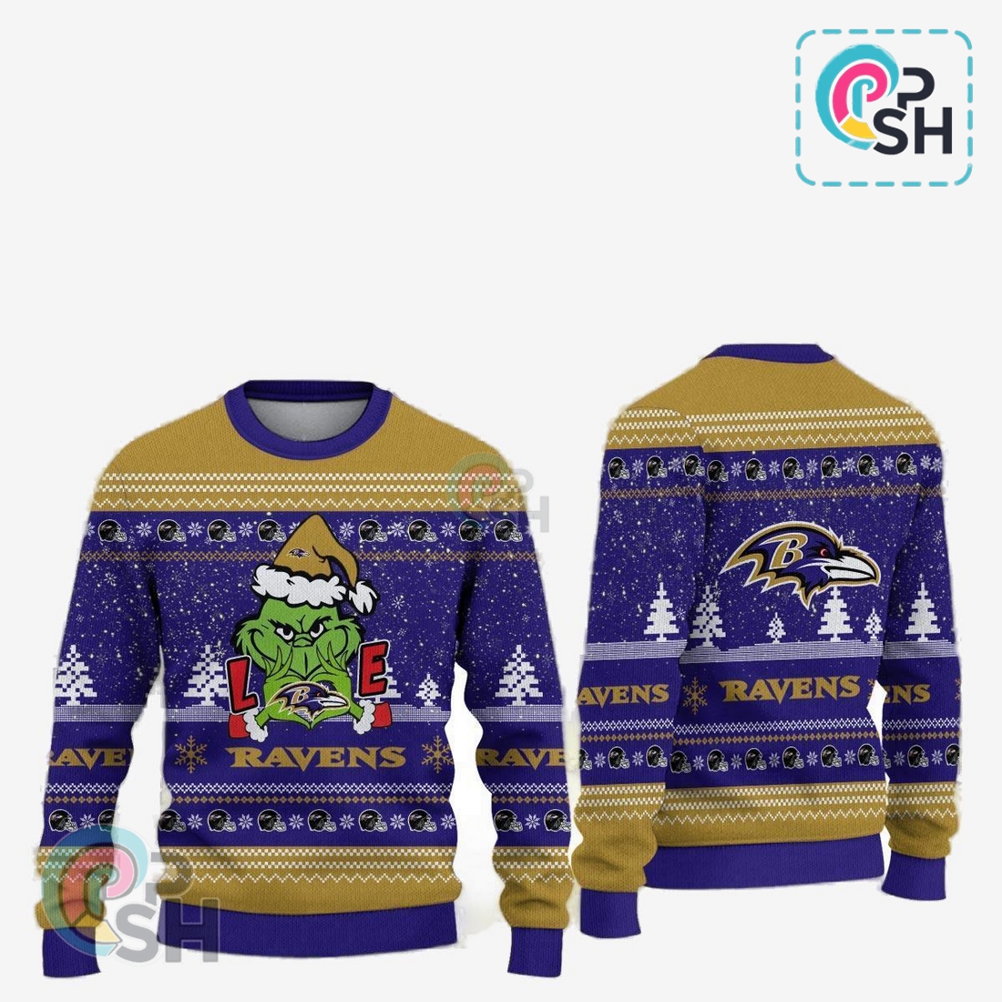 The Baltimore Ravens Limited Ugly Christmas Sweaters stand as a quintessential piece of fan apparel, meticulously designed to fuse fervent team loyalty with the whimsical spirit of the holiday season, directly addressing the desires of any purple and black faithful seeking to celebrate both passions simultaneously. This exclusive garment masterfully blends the iconic Ravens aesthetic with playful, intentionally “ugly” Christmas motifs, creating a distinctive look that is both eye-catching and deeply personal for supporters. Each sweater prominently features the legendary Baltimore Ravens raven head logo, often intertwined with festive elements like snowflakes, holiday trees, or even miniature footballs adorned with Santa hats, all rendered in the team’s unmistakable color palette of deep purple, black, and touches of gold. The design might incorporate “ugly” sweater staples such as oversized patterns, deliberately mismatched textures, or even humorous depictions of ravens engaging in holiday activities, all meticulously knitted into the fabric rather than merely printed, ensuring a high-quality, authentic sweater feel that will stand the test of time.