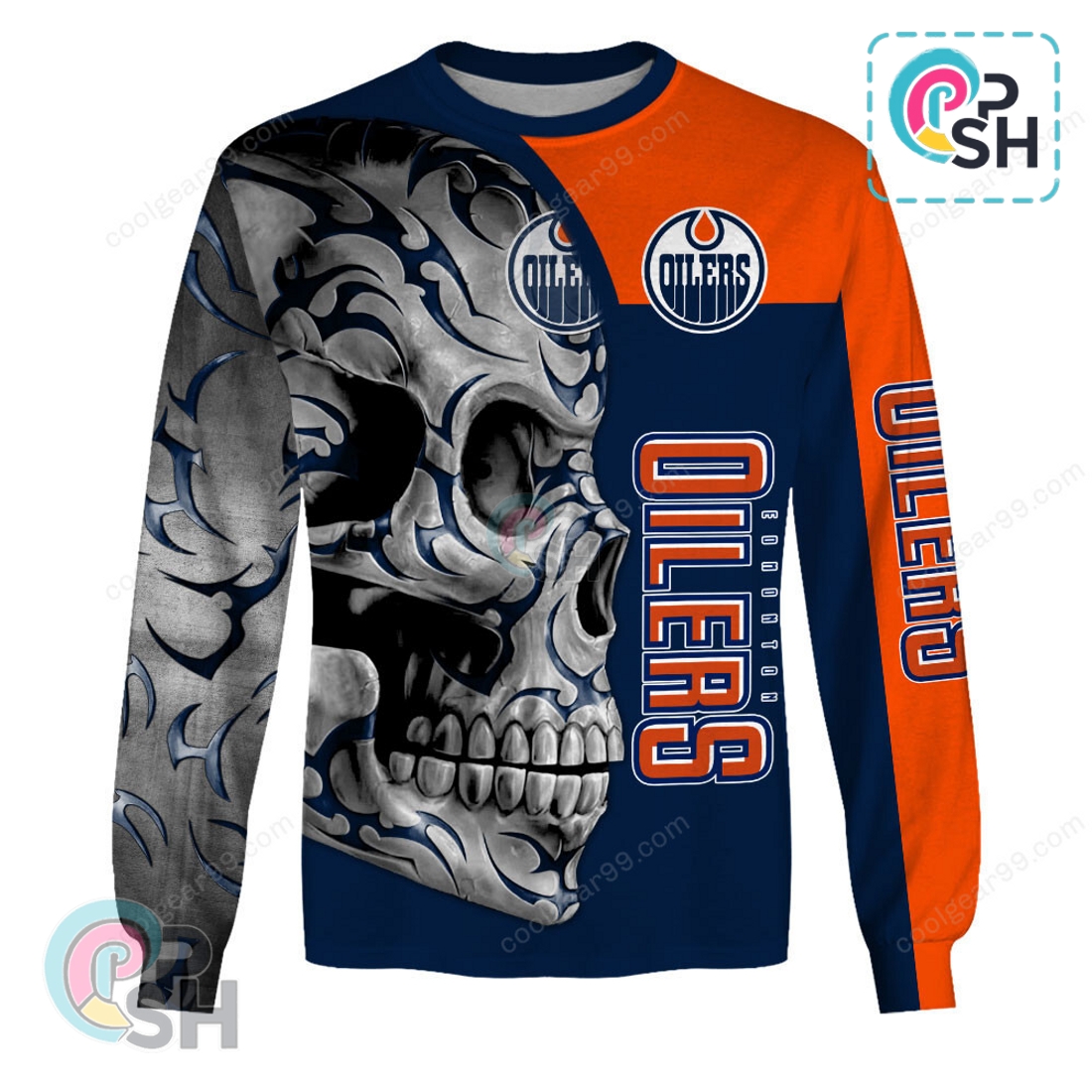 The Edmonton Oilers Skull Fury Hoodie presents an unparalleled blend of fierce team spirit and exceptional comfort, designed specifically for devoted fans seeking to express their loyalty with a distinct edge. This isn’t merely another piece of fan apparel; it’s a bold declaration, meticulously crafted to stand out in a sea of standard logos and designs. At its core, the hoodie showcases a truly striking graphic: a powerful, stylized skull, not cartoonish or overtly aggressive, but imbued with an intense energy that perfectly encapsulates the “Fury” aspect of its name. This skull isn’t just a generic image; it subtly integrates elements reminiscent of the Oilers’ iconic visual language, perhaps through its contours or the way the team’s classic blue, orange, and white palette is artfully interwoven within its design, creating a mesmerizing fusion that’s both intimidating and undeniably loyal. The Oilers’ primary logo or wordmark is expertly placed, either as a prominent feature within the skull itself or strategically positioned alongside it, ensuring that team allegiance is immediately recognized without detracting from the unique skull motif. This dynamic visual statement offers fans an opportunity to move beyond conventional team merchandise, allowing them to showcase their support with a design that resonates with a more modern, perhaps even a more rebellious, aesthetic while remaining true to the team’s heritage.