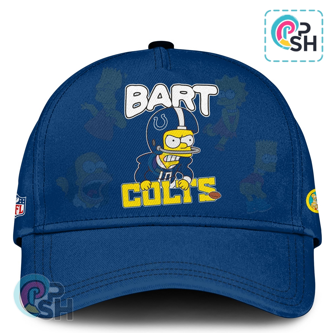 Complementing the hoodie is a matching cap, designed with the same meticulous attention to detail and thematic coherence. Fashioned from a durable yet comfortable cotton twill, the cap features a classic six-panel construction, offering a structured, flattering profile. Its front panel proudly displays an expertly embroidered design that echoes the hoodie’s crossover theme. This might be a smaller, refined version of the Homer-Colts emblem, or perhaps a distinct yet related graphic, like Bart Simpson sporting a miniature Colts helmet, all brought to life with precision stitching that highlights every line and color. The embroidery ensures a premium, tactile finish that stands out from simple prints, signifying quality and longevity. The cap comes equipped with an adjustable strap-back closure, often featuring a metal buckle or a sturdy snap-back, allowing for a customized and comfortable fit for a wide range of head sizes. Its pre-curved brim offers sun protection and contributes to a timeless, sporty aesthetic.