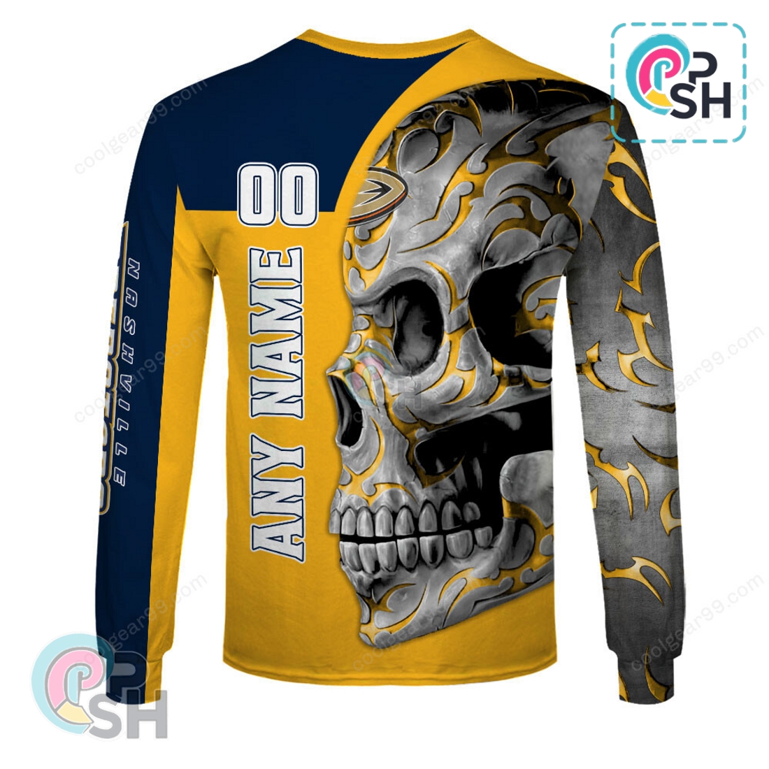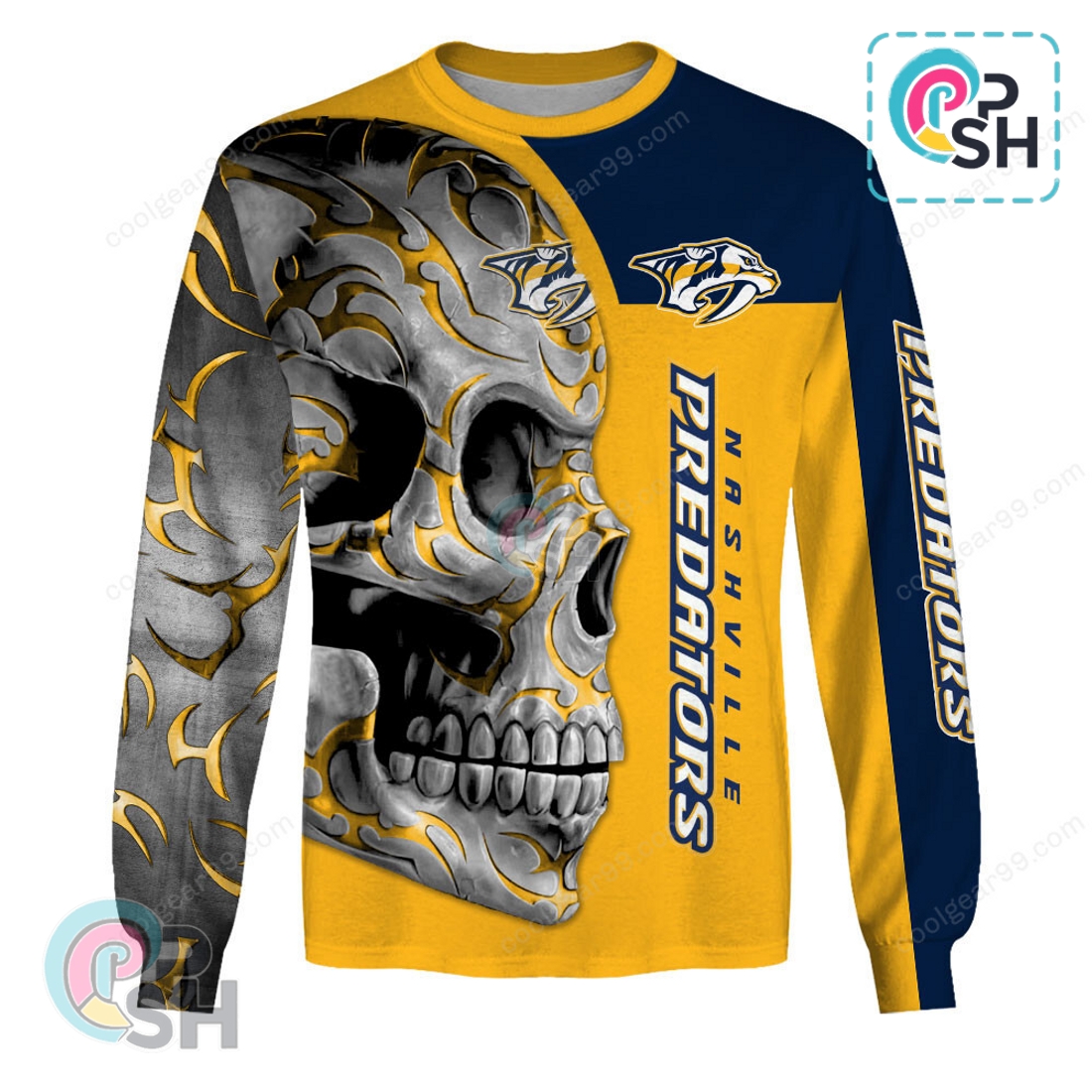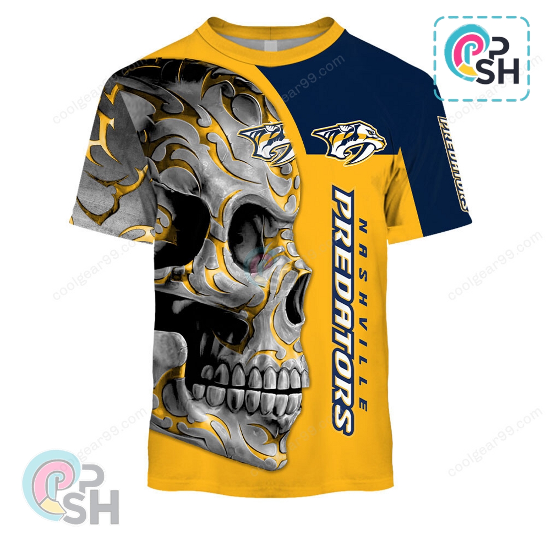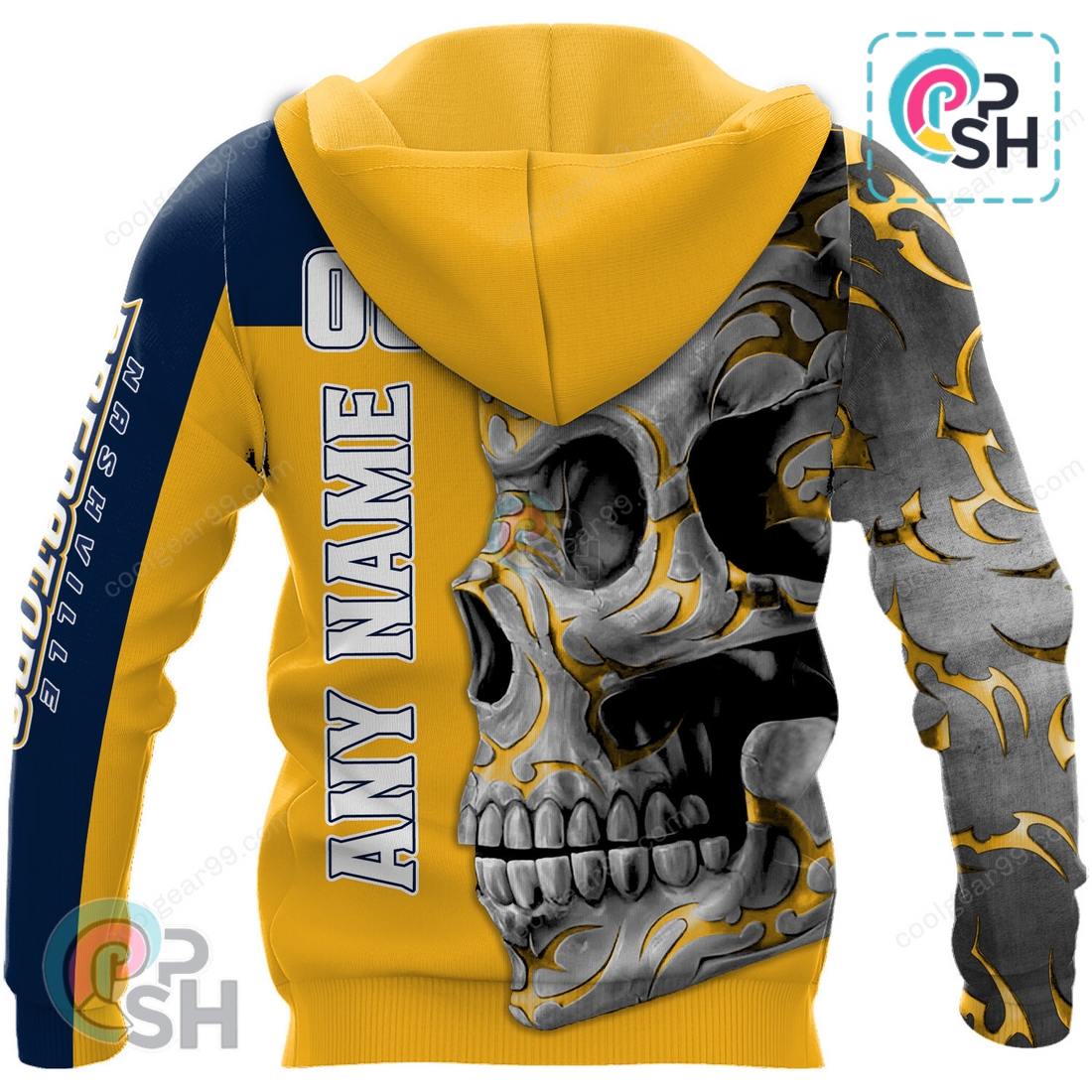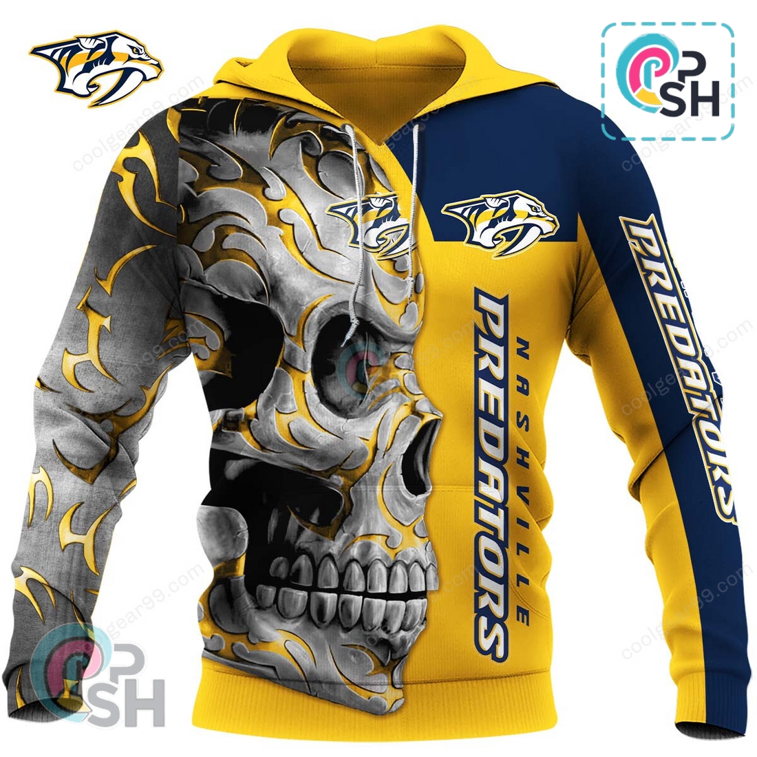 The Nashville Predators Skull Fury Hoodie stands as an undeniable statement piece for any loyal fan, seamlessly blending fervent team support with an edgy, distinctive style that demands attention. Its core appeal lies in the aggressive “Skull Fury” graphic, prominently displayed, typically across the chest, where a stylized, menacing skull is ingeniously integrated with or emerges from the iconic Nashville Predators logo. This isn’t merely a static emblem; the skull often features intricate detailing, sharp lines, and shadowed contours that give it a fierce, almost animated presence, distinguishing it from standard team merchandise. The team’s signature gold and blue, or sometimes a stark white, are expertly woven into the design, providing vibrant contrast against a deep, often charcoal or black, base fabric, ensuring the graphics pop with undeniable intensity and superior print quality that resists cracking or fading. Additional team branding, such as the secondary saber-toothed tiger logo or wordmarks, might be subtly placed on sleeves or the back, reinforcing allegiance from every angle without overwhelming the primary skull motif. Beyond its striking aesthetics, this hoodie is engineered for comfort and lasting wear, addressing the practical needs of any devoted supporter. Constructed from a premium blend, typically a substantial mix of cotton and polyester, it offers the best of both worlds: the natural softness and breathability of cotton paired with the durable, wrinkle-resistant qualities of polyester. The interior boasts a plush, brushed fleece lining that provides exceptional warmth and a luxuriously soft feel against the skin, making it an ideal choice for chilly game nights, crisp autumn days, or simply lounging in ultimate comfort. The hood itself is generously sized and often features adjustable drawstrings, allowing wearers to cinch it tight against the elements or relax its fit for casual wear. Ribbed cuffs and hem ensure a snug, secure fit that helps retain warmth and maintains the garment’s shape through repeated wear and washes, preventing stretching or sagging. A spacious kangaroo pocket at the front offers a convenient place to warm hands or store essentials like keys, a phone, or tickets, enhancing its functional appeal. For the individual seeking more than just a simple logo shirt, this hoodie perfectly satisfies the need to express their Predators pride with an added layer of personality and grit, appealing to fans who appreciate a bolder aesthetic that reflects the fierce competitive spirit of their beloved team. The quality construction means it’s not just a seasonal item but a durable piece of fan apparel that will withstand countless washes and wears, becoming a long-term staple in their wardrobe. Its substantial feel and insulating properties make it invaluable for tailgates in adverse weather, stadium visits where temperatures can drop, or simply for staying cozy at home while watching the game broadcast. This combination of robust warmth, superior comfort, and an unmistakable, edgy design sets it apart, ensuring that wearers not only stay warm but also make a powerful, clear statement of their loyalty, forging a stronger connection to the team and fellow fans. It’s a versatile garment, equally at home paired with jeans for a casual outing, layered over a t-shirt for added warmth, or donned as the ultimate declaration of fandom during playoff runs, providing both practical utility and profound emotional connection to the Nashville Predators.
