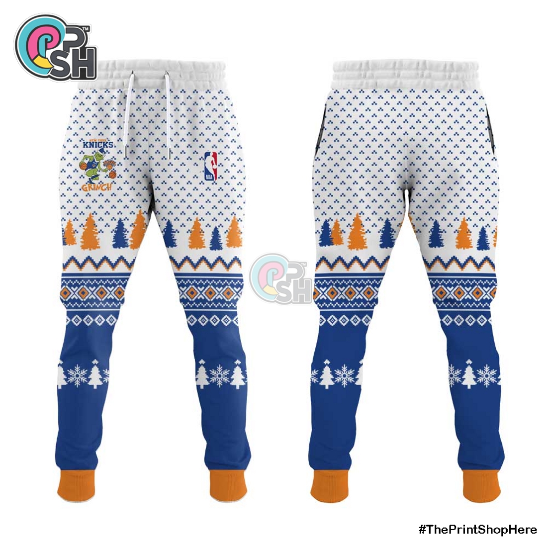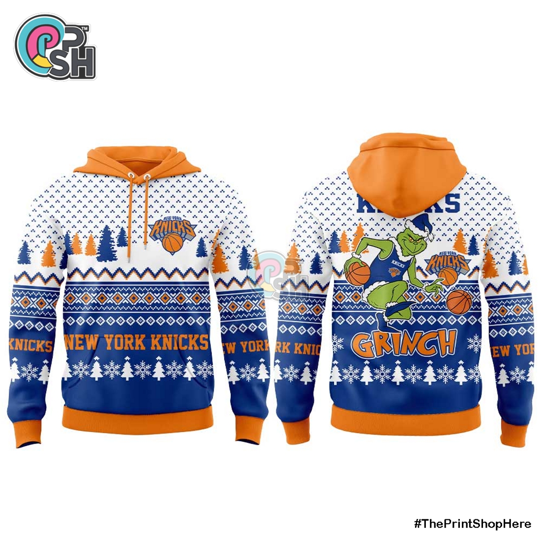 Complementing the hoodie in both design and comfort are the matching pants, featuring the same ultra-soft fleece material that feels incredible against the skin. These pants boast a relaxed jogger silhouette, perfect for lounging, yet stylish enough for casual outings. An elasticized waistband, reinforced with an adjustable drawstring, guarantees a personalized and comfortable fit for various body types, while deep side pockets offer practicality for carrying small items. Tapered legs ending in snug ribbed cuffs prevent cold drafts and keep the pants securely in place, whether you’re cheering courtside or unwrapping presents. The visual narrative woven across both pieces is where this set truly shines: the instantly recognizable New York Knicks logo, rendered with a festive flair, forms the backdrop for a mischievously grinning Grinch. He might be depicted wearing a Knicks-orange Santa hat or playfully attempting to “steal” a basketball instead of Christmas, adding a clever, specific twist. Intricate embroidery and high-definition screen printing ensure that every detail, from the Grinch’s furrowed brow to the iconic Knicks lettering, is sharp, fade-resistant, and built to last. Snowflake motifs, candy cane stripes, and other subtle holiday embellishments seamlessly blend with the team’s signature blue and orange color palette, creating a cohesive and spirited design that’s simultaneously loyal and festive. This thoughtful blend makes the set far more than just “ugly Christmas wear”; it’s a premium piece of fan apparel that genuinely celebrates two beloved cultural touchstones.