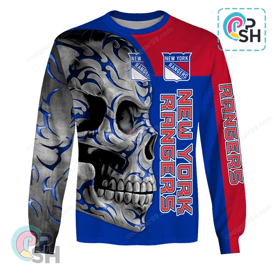 This isn’t merely another piece of fan merchandise; the New York Rangers Skull Fury Hoodie stands as a formidable declaration of allegiance, designed for the supporter whose passion burns with an intensity that demands to be seen and felt. The true marvel of this garment lies in its audacious “Skull Fury” graphic, a masterfully rendered visual spectacle that fuses the iconic New York Rangers identity with an aggressive, highly stylized skull motif. Imagine a powerful, detailed skull, its contours artfully sculpted to convey an undeniable sense of ferocity and determination. This isn’t a cartoonish representation; it’s a sophisticated, almost menacing portrayal, often depicted with piercing, ice-blue eyes that seem to fixate on victory. Integrated seamlessly within this potent imagery are classic Rangers elements: perhaps the team’s legendary shield emblem subtly embossed on the skull’s forehead, or crossed hockey sticks forming a formidable backdrop, all rendered in the unmistakable red, white, and blue against a deep, commanding base color like navy or black. The graphic itself is typically screen-printed with precision or embroidered with meticulous detail, ensuring not only vibrant color and sharp lines but also exceptional durability that will withstand countless washes and wearings without fading or cracking, keeping your declaration of loyalty as pristine as your resolve.