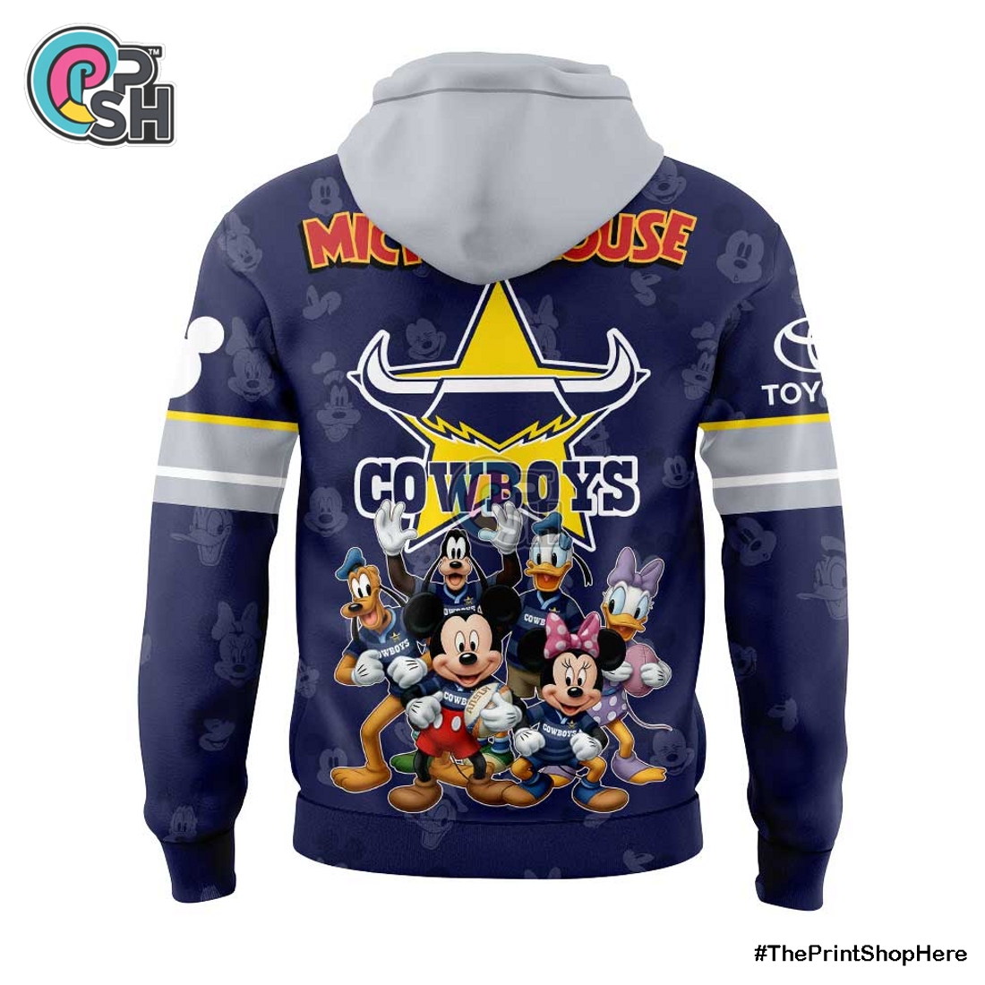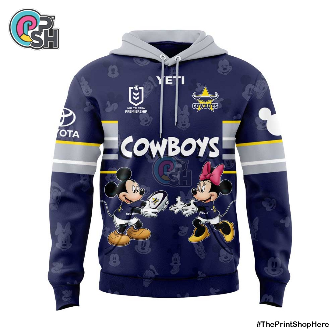 This distinctive apparel offering presents a remarkable fusion of two beloved worlds, bringing together the spirited energy of the North Queensland Cowboys and the timeless charm of Disney’s Mickey Mouse in a comfortable, stylish two-piece set. At its core, this hoodie and long pants ensemble is a testament to inventive design, seamlessly blending the iconic elements of a formidable NRL team with the universally recognized whimsical appeal of Mickey Mouse. For fans of the NQ Cowboys, this isn’t just another piece of team merchandise; it’s an elevated expression of loyalty, infused with a playful, nostalgic twist that sets it apart. The design typically integrates the Cowboys’ distinctive club colors – often shades of blue, yellow, and white – alongside their official logo, which might be reimagined or presented in a unique context to subtly or overtly include Mickey. For instance, graphics might depict Mickey Mouse in a playful action pose, perhaps catching a rugby ball, or his silhouette cleverly integrated into a stylized Cowboys star or emblem. This thoughtful cross-branding ensures that the garment resonates deeply with supporters who want to celebrate their team spirit while also appreciating the enduring legacy of one of the world’s most cherished cartoon characters. It’s an ideal way for multi-generational families to connect over shared passions, appealing to both seasoned Cowboys fans and younger enthusiasts who grew up with Mickey, bridging the gap between sports fandom and classic pop culture.