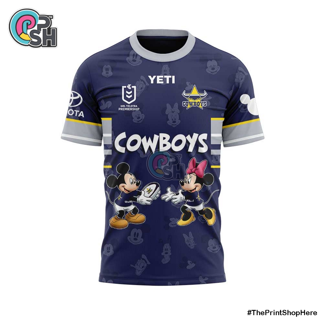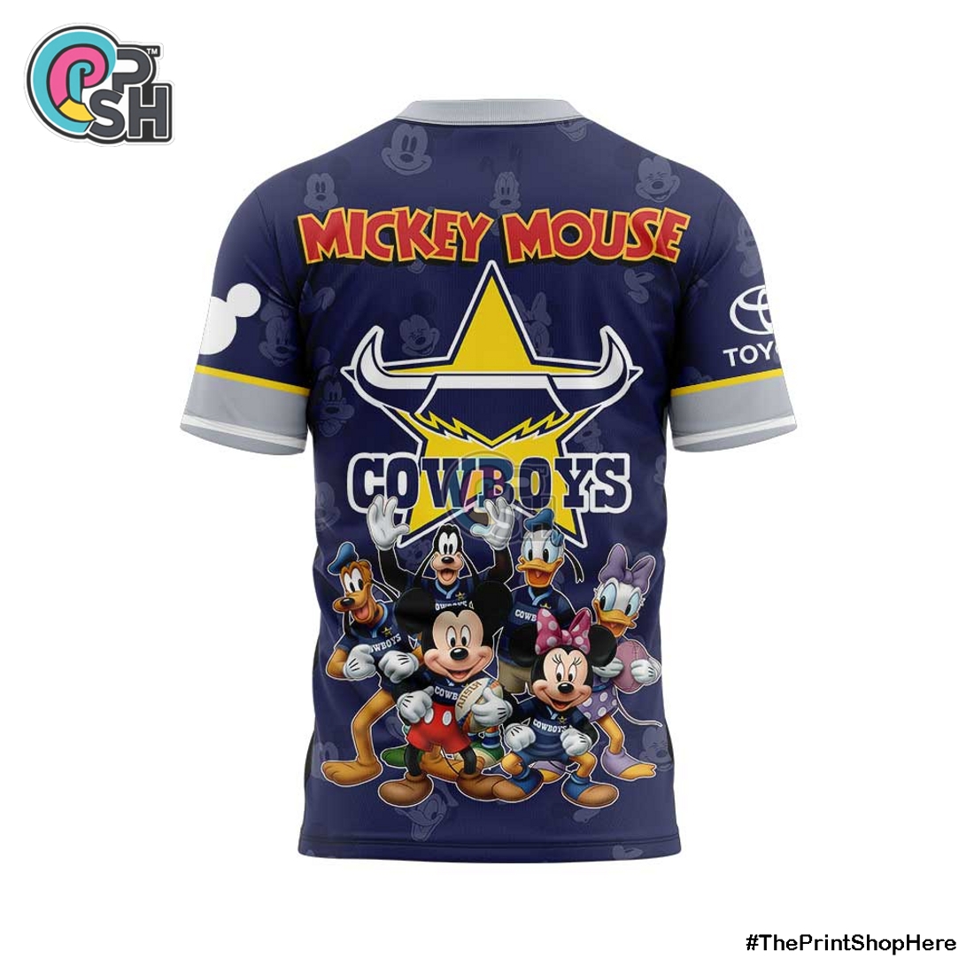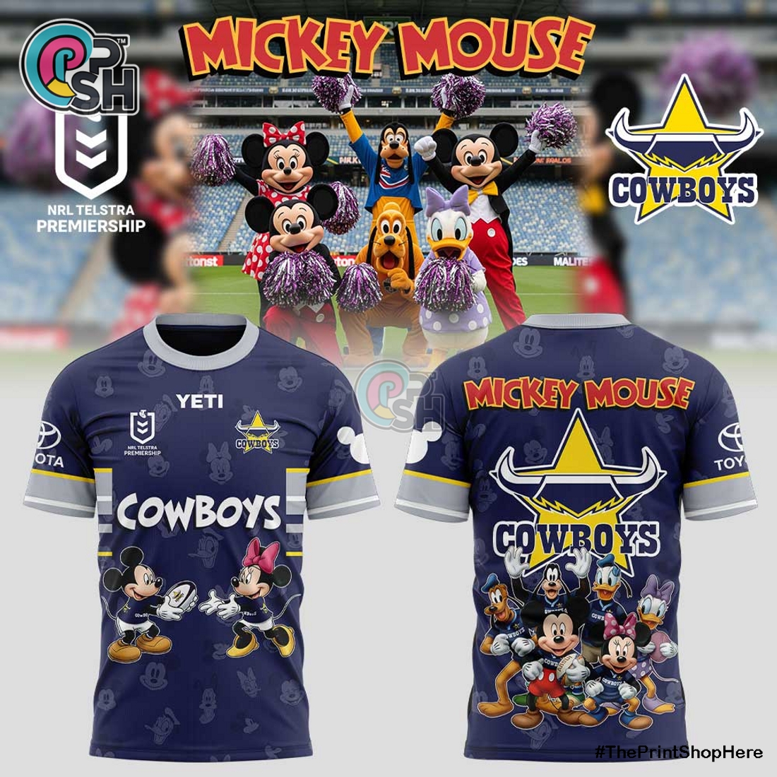 The NQ Cowboys x Mickey Mouse Limited Edition Shirt offers a striking fusion of athletic passion and beloved animation, meticulously designed for individuals who appreciate unique style, premium quality, and a touch of nostalgic charm. This exclusive garment masterfully blends the spirited identity of the North Queensland Cowboys with the universally adored persona of Mickey Mouse, creating a truly distinct piece of fan apparel and collectible merchandise. Its primary appeal lies in its ingenious design; the front of the shirt proudly showcases a specially commissioned graphic where Mickey Mouse is depicted not in his usual attire, but playfully integrated with the Cowboys’ brand. Imagine Mickey, perhaps sporting a miniature NQ Cowboys jersey complete with the iconic club logo and team colors, striking a dynamic pose that perfectly captures the energy and excitement of rugby league. This central graphic is rendered using high-definition screen printing, ensuring vibrant, lasting colors and crisp details that will not fade or crack even after numerous washes, standing out vividly against the shirt’s carefully selected base color, likely a rich navy blue or a sophisticated charcoal grey, chosen to complement both brand aesthetics.