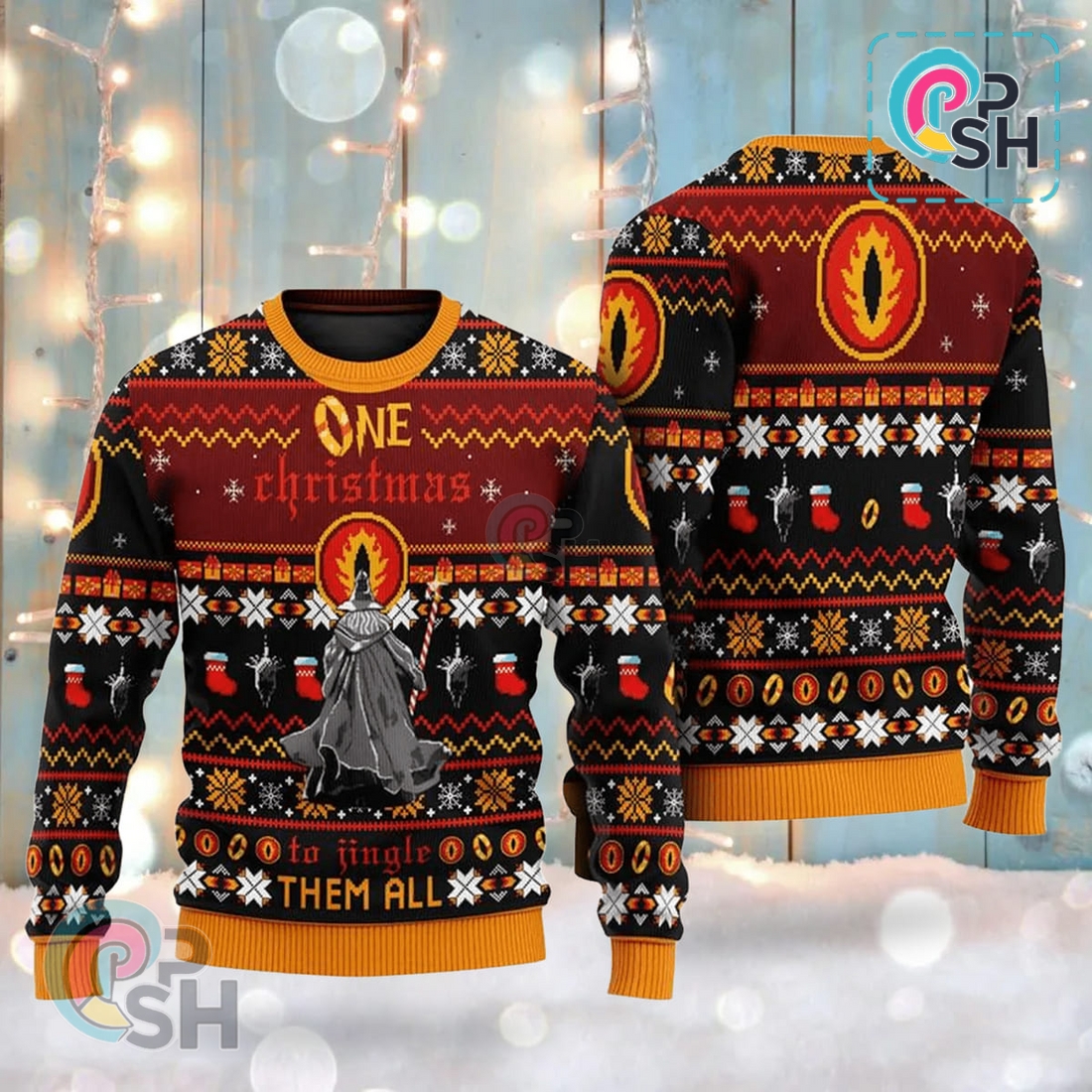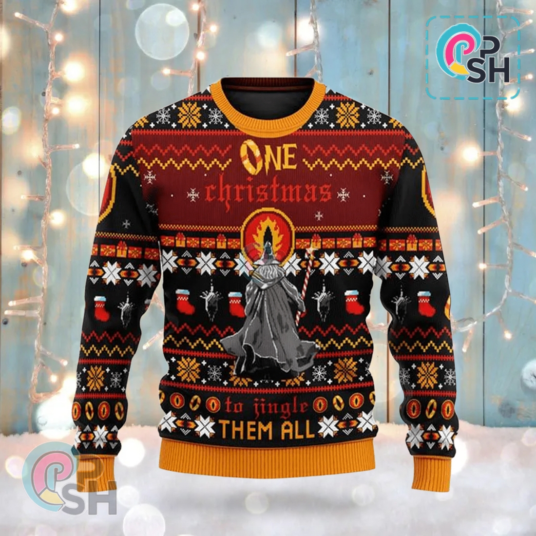 This festive garment, aptly named “One Christmas To Jingle Them All Gandalf The Lord Of Ring Knitted Sweater,” stands as a beacon of holiday cheer and epic fantasy fandom, meticulously designed for those who appreciate both. The sweater immediately captivates with its central theme, brilliantly merging the timeless wizardry of Gandalf with the joyful exuberance of the Christmas season. At its core, the design features a majestic depiction of Gandalf the Grey, perhaps in a slightly more festive pose than usual, complete with his iconic pointed hat, flowing beard, and staff, all rendered in a high-quality knit that captures intricate details. Surrounding our beloved wizard, the sweater cleverly incorporates elements from Middle-earth alongside traditional holiday motifs.