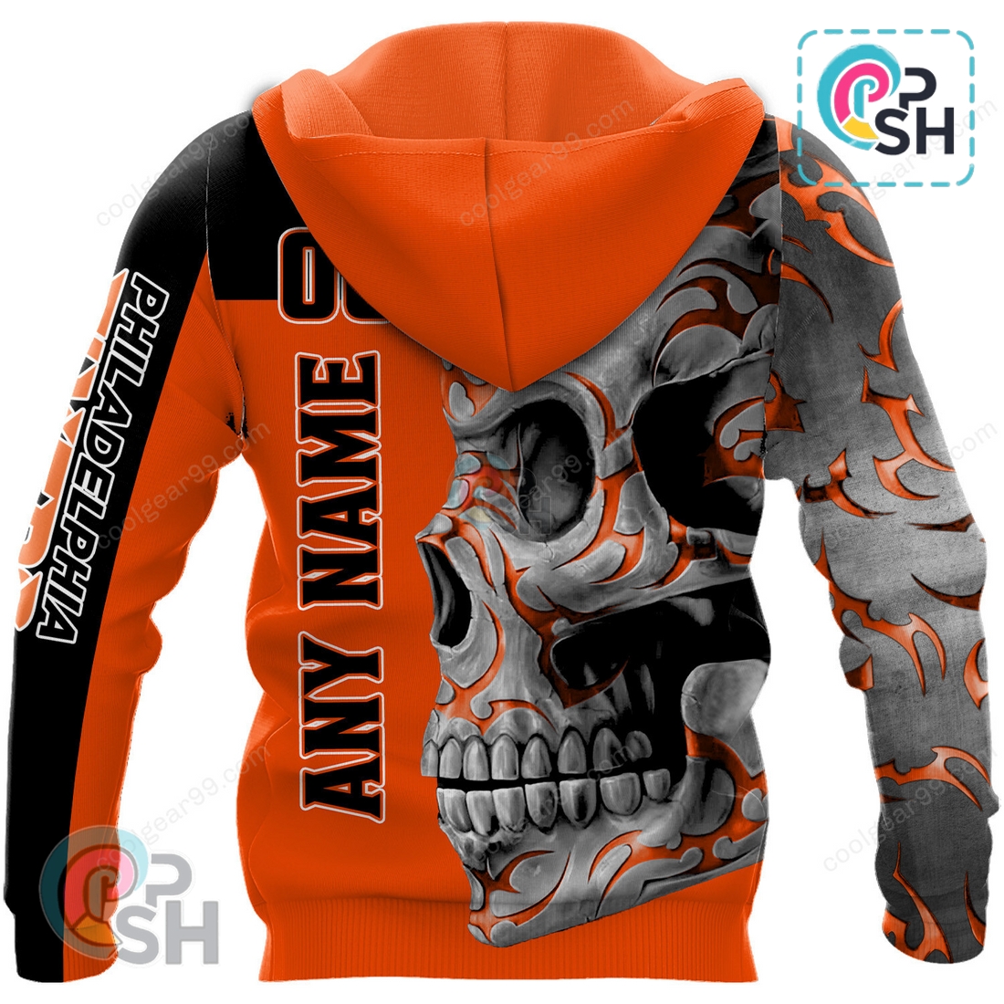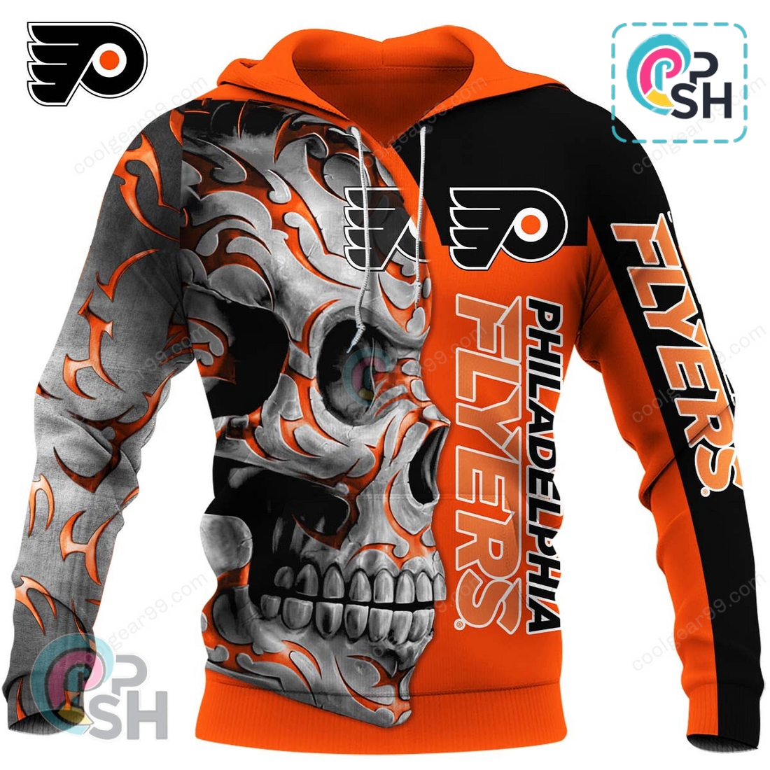 This Philadelphia Flyers Skull Fury Hoodie offers a potent blend of fierce team pride, uncompromising comfort, and lasting quality, designed specifically for the most ardent supporters. It transcends typical fan apparel by featuring a unique, eye-catching graphic that immediately sets it apart. The central design showcases a highly stylized, aggressive skull, masterfully integrated with iconic Flyers elements. Imagine a gritty, detailed skull rendered with dynamic lines and shadows, its eyes perhaps glowing with the team’s signature orange, subtly incorporating the Flyers’ “P” logo or a pair of crossed hockey sticks into its menacing structure. This isn’t just a logo slapped onto fabric; it’s a statement, a visual roar in bold black and orange against a contrasting base, perfectly capturing the tenacious and unyielding spirit of the Broad Street Bullies. The design placement is critical, typically a large, prominent graphic centered on the chest, ensuring maximum impact and visibility.