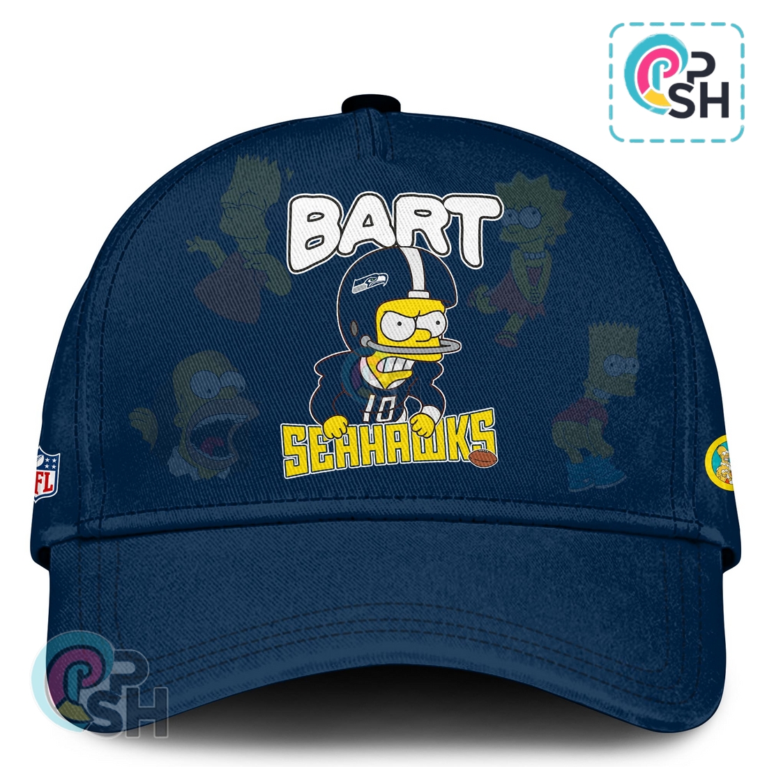 Complementing the hoodie is the meticulously crafted limited edition cap, designed to complete the ensemble with equally impressive detail and style. Typically a classic six-panel baseball cap, it features a durable yet breathable twill fabrication, ensuring comfort and longevity. The pre-curved brim offers optimal sun protection and maintains a timeless sporty aesthetic. The front panel proudly showcases an embroidered, detailed rendition of the Simpsons-Seahawks crossover art, mirroring the hoodie’s theme but adapted perfectly for headwear. This might include a stylized hybrid logo or a specific character striking a pose that embodies both franchises. Ventilation eyelets are strategically placed to ensure breathability, while an adjustable snapback or strapback closure guarantees a comfortable, customized fit for nearly any head size, making it incredibly versatile. Subtle branding, such as the official NFL shield on the side or a discrete “Limited Edition” patch, further underscores its exclusive nature and authenticity. Both the hoodie and cap are presented in a cohesive color palette, predominantly featuring the Seahawks’ iconic action green, navy blue, and wolf grey, expertly interwoven with the familiar Simpsons yellow and other character-specific hues, creating a harmonious and eye-catching visual synergy.