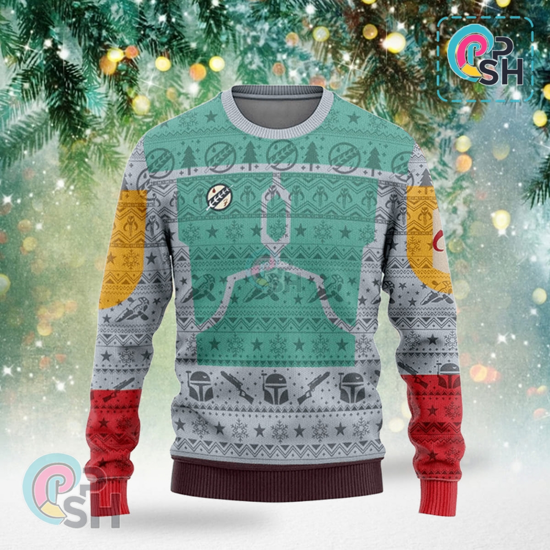 Observing the sweater’s detailed design, one immediately notices the striking central image of Boba Fett’s iconic helmet and upper armor, rendered with remarkable clarity through sophisticated knitting techniques. His characteristic T-visor and the subtle battle-damage on his helmet are faithfully depicted, bringing an authentic touch to the festive theme. Rather than a fierce scowl, the overall presentation leans into a good-natured holiday spirit, often featuring subtle seasonal modifications like a tiny Santa hat perched atop his helmet or a backdrop adorned with festive elements. The surrounding knit patterns expand on this theme, typically incorporating classic Christmas motifs such as snowflakes, candy canes, and stylized Christmas trees, seamlessly intertwined with subtle nods to the Star Wars universe – perhaps miniature starships or Mandalorian skull sigils cleverly integrated into the border patterns. The color palette expertly blends Boba Fett’s signature greens, grays, and browns with vibrant holiday reds, whites, and greens, creating a visually cohesive and undeniably festive aesthetic that is both recognizable to fans and appealing to the casual observer. The jacquard knit construction ensures that these intricate details are woven directly into the fabric, providing a premium feel and preventing any fading or cracking often associated with printed designs.